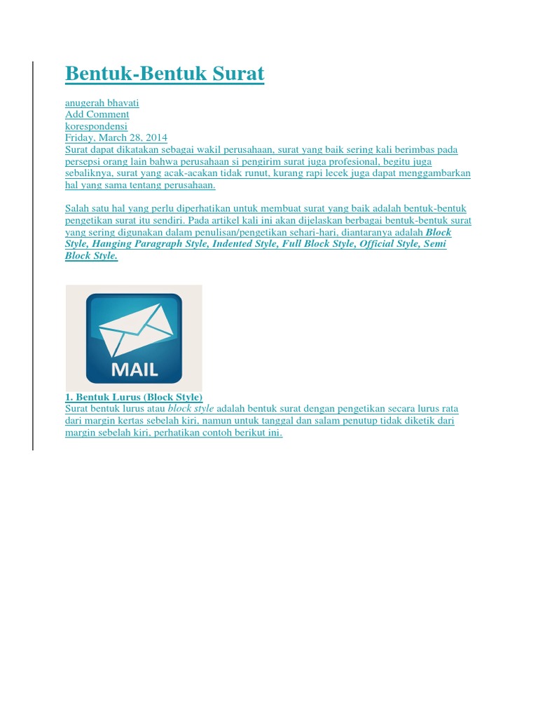 Contoh bentuk surat official style. Bentuk surat menggantung atau surat bentuk alinea menggantung juga disebut sebagai hanging paragraph stylese tiap alinea pada surat bentuk menggantung ditulis secara menggantung. Contoh bentuk surat old official style have a graphic from the othercontoh bentuk surat old official style it also will feature a picture of a sort that might be seen in the gallery of contoh bentuk surat old official style. Resmi official style bentuk surat ini merupakan bentuk surat yang sering digunakan pada instansi instansi pemerintahan. Contoh surat official style doqumencom contoh surat full block style perkenalan perusahaan bagi info contoh surat teknik surat menyurat. Pada bentuk tulisan gaya lama alamat sejajar dengan perihal dan tempat menjorok lima spasi. Pt al fukroh mobilindo indonesia jalan raya asia afrika no25 é 0254574749 wwwalfukrohmobilindoacid cilegon banten.