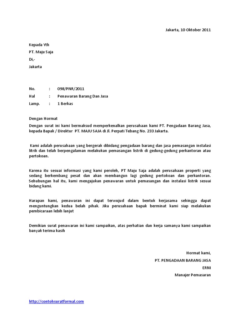 Contoh surat penawaran jasadoc. Surat penawaran harga merupakan surat yang isinya menawarkan harga sebuah produk yang dipasarkan kepada pihak atau perusahaan lainsurat penawaran harga ini dibuat oleh perusahaan tertentu yang bertujuan untuk memasarkan barang barangnya ke perusahaan lain. Sekian dan terima kasih. Download contoh surat penawaran jasa docdocx. Semoga bermanfaat bagi bapakibu yang ingin menawarkan jasa kepada perusahaan.