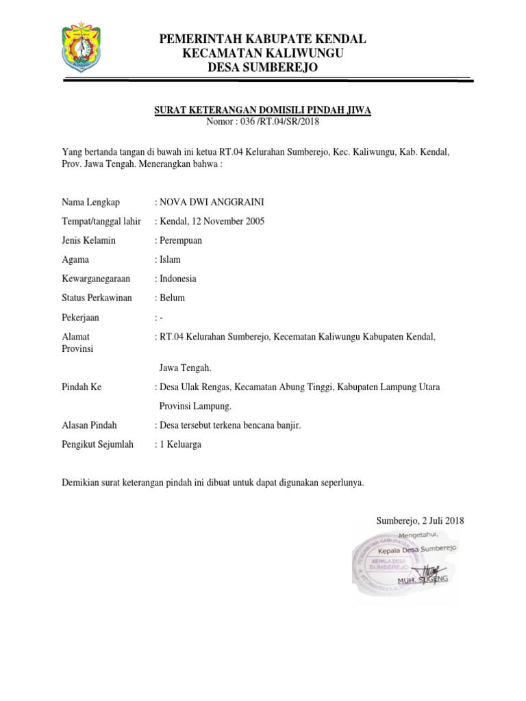 Contoh surat pindah domisili ke luar kota. Dinas pemerintahan kabupaten kudus.