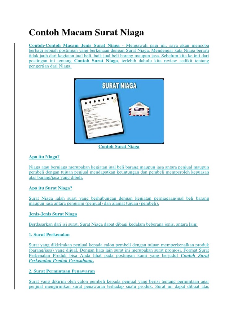 Contoh macam macam surat niaga. Beberapa proses dalam perdagangan tersebut kemudian membuat adanya beberapa jenis surat niaga. Dalam perdagangan atau jual beli terjadi beberapa proses yang saling berkaitan satu dengan yang lainnya. Contoh surat niaga terbaru merupakan hashtag atau topik khusus untuk mengelompokkan kumpulan surat niaga dari situs kumpulan contoh surat dengan tujuan untuk memudahkan navigasi anda dalam mencari kategori sesuai keinginan. 15 contoh surat niaga untuk perusahaan dan badan usaha untuk memperlancar perdagangan maupun kerjasama tentu harus dibutuhkan komunikasi yang intens antara satu pihak dengan pihak lainnya. 15 contoh surat niaga penawaran untuk berbagai keperluan surat niaga penawaran dibuat untuk melakukan penawaran barang jasa atau kerjasama dalam bentuk surat resmi. Peralatan dan mesin kantor.
