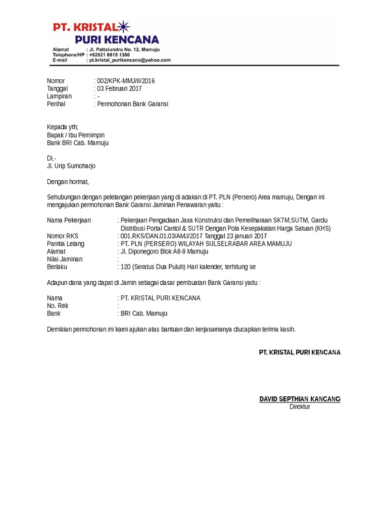 Tanggal 01 mei 2019 bank xyz surabaya menerbitkan bank garansi atas permintaan pt pantang menyerah surabaya yang ditujukan kepada pt terus berupaya network jakarta. Apabila nominal kewenangan persetujuan penerbitan garansi bank merupakan kewenangan pemimpin cabang maka cukup ditandatangani oleh pemimpin cabang dan persetujuan tidak perlu diteruskan kepada hbb. Maksud pemberian jaminan ini adalah bank menjamin akan membayarmemenuhi kewajiban kewajiban dari pihak yang dijaminkan kepada pihak yang menerima jaminan apabila pada kemudian hari yang dijamin tidak. Untuk lebih jelasnya berikut kami lampirkan contoh contoh surat garansi yang dapat anda jadikan referensi dalam pembuatan surat garansi sesuai kebutuhan. Contoh surat permohonan pencairan garansi bank have a graphic from the othercontoh surat permohonan pencairan garansi bank it also will feature a picture of a kind that may be seen in the gallery of contoh surat permohonan pencairan garansi bank.