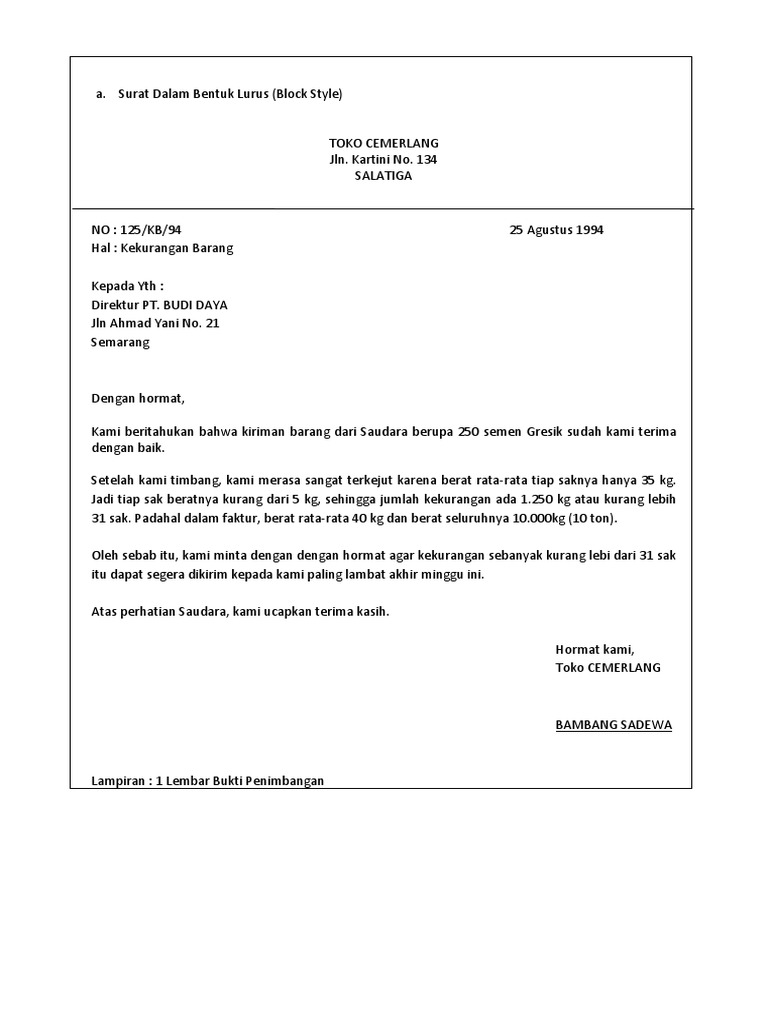 Contoh surat bentuk lurus block style. Surat yang juga disebut sebagai surat bentuk lurus ini merupakan kombinasi dari bentuk surat full block style dan semi block style. Dalam ilmu administrasi perkantoran memang ada beberapa jenis surat yang dipelajari berdasarkan bentuknya. Apa itu surat bentuk lurus block style. Contoh surat full block style bentuk surat ini disebut juga dengan surat bentuk lurus penuh. Jadi surat dengan model full block style memiliki bentuk atau susunan yang lurus dari atas sampai bawah. Bentuk bentuk surat yang dapat digunakan adalah bentuk lurus penuh full block style bentuk lurus block style bentuk setengah lurus semi block style bentuk lekuk indented style bentuk menggantung hanging paragraph style bentuk resmi official style.
