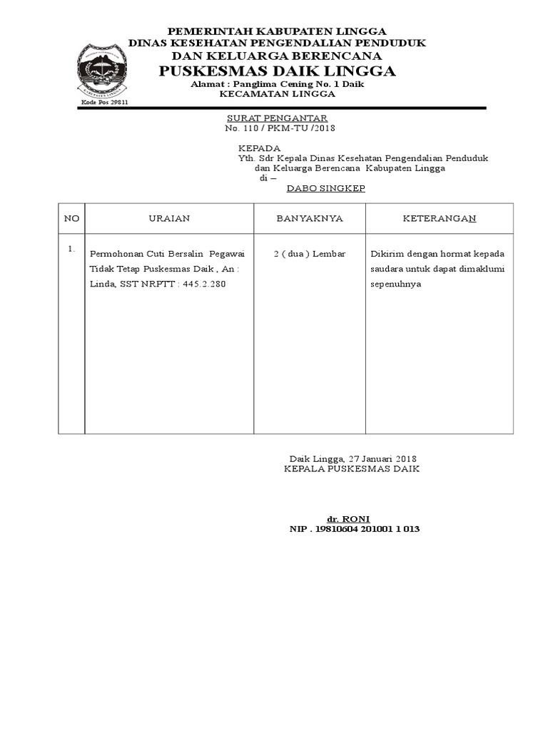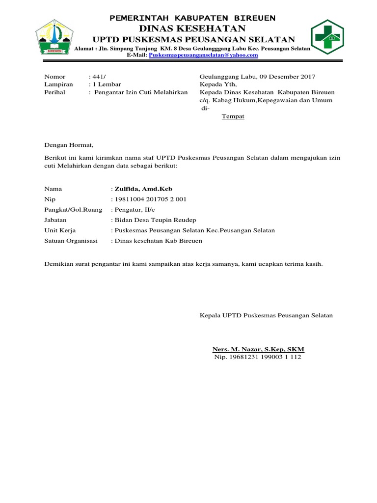 Namun terlebih dahulu anda pun harus menyampaikan surat permohonan cuti. Bagi karyawan surat cuti bukanlah hal yang baru karena semua karyawan pasti mengetahui tentang apa yang dimaksud dengan surat cuti. Silakan download contoh surat keterangan kelahiran dari bidan di atas dalam format msword yang sudah di format 1 lembar bisa jadi 2 surat keterangan. Download 35 contoh surat lamaran kerja guru doc pdf kepala. Contoh surat cuti melahirkan dari puskesmas. Pengambilan cuti sementara ini dipersiapkan untuk para perempuan agar bisa menyiapkan proses persalinan tanpa harus memikirkan beban pekerjaan.