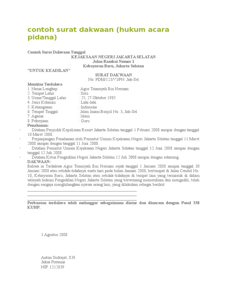Contoh surat dakwaan jenis dakwaan tunggal mengenai percobaan pencurian kejaksaan negeri tangerang untuk keadilan surat dakwaan no. Download contoh surat dakwaan doc.