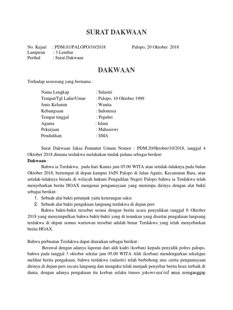 Contoh surat dakwaan penganiayaan. Bahwa dalam surat dakwaan yang dajukan oleh jaksa penuntut umum tidak diuraikan secara cermat jelas dan lengkap tempat kejadian perkara tkp peristiwa tindak pidana tersebut terjadi jaksa penuntut umum hanya menyebutkan tempat kejadian locus delicti tersebut dirumah korban tetapi tidak menjelaskan secara pasti dimana tepatnya tempat penganiayaan itu dilakukan. Dalam dakwaan alternatif meskipun dakwaan terdiri dari beberapa lapisan hanya satu dakwaan saja yang dibuktikan tanpa harus memperhatikan urutannya dan jika salah satu telah terbukti maka dakwaan pada lapisan lainnya tidak perlu dibuktikan lagi. Selain itu gambar ini juga memiliki berbagai ukuran. Dalam bentuk surat dakwaan ini antara lapisan satu dengan yang lainnya menggunakan kata sambung atau. Contoh surat dakwaan tunggal kasus penganiayaan sebagai bahan referensi dalam pembuatan surat tuntutan yang baik dan benar. Contoh surat visum penganiayaan.