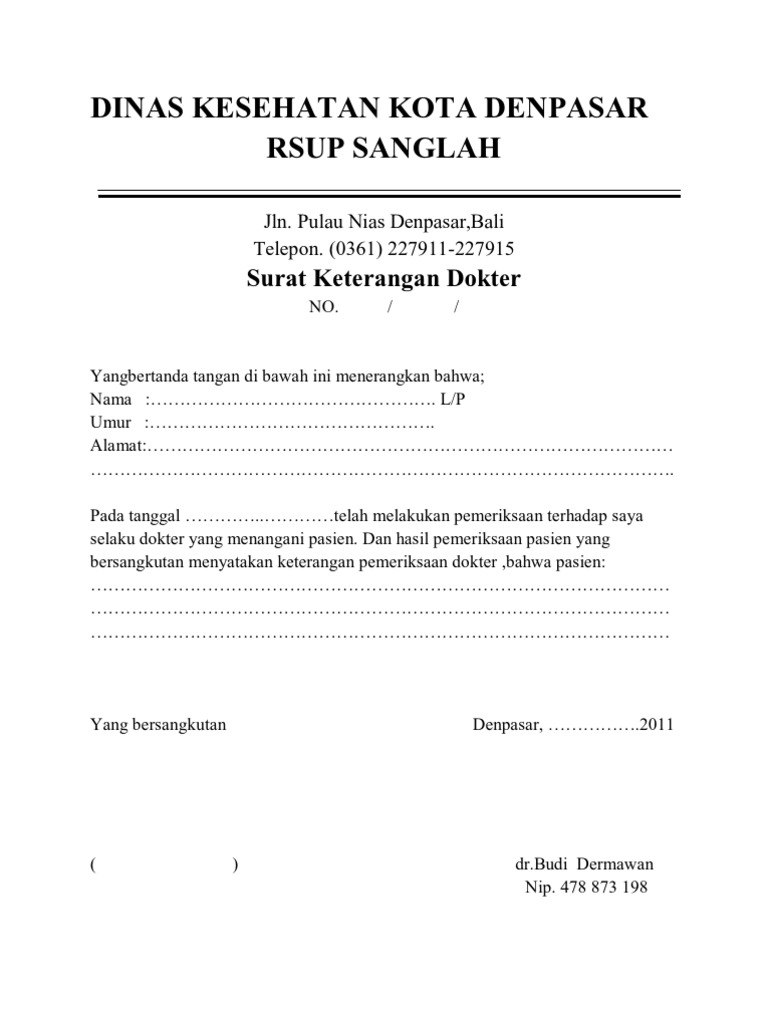 Ada pula rekomendasi lamanya waktu istirahat dari dokter pemeriksa. 15 contoh surat dokter untuk berbagai keperluan dalam berbagai hal dan urusan surat keterangan dari dokter sangatlah diperlukan. Contoh surat kuasa yang akan kita bahas pada artikel kali ini bukan saja hanya sebatas contoh surat kuasa melainkan begaimana cara membuat format surat kuasa yang benar untuk referensi bagi anda yang sedang membuat surat kuasa. Surat ini diperlukan untuk memberitahukan kondisi kesehatan yang sedang dialami oleh seseorang dengan harapan mendapatkan izin tidak masuk kerja karena sakit. Surat dc dokter denpasar surat resmi biasanya banyak digunakan bagi keperluan instansi organisasi keperluan dinas ataupun kepentingan. Contoh surat dokter di bali have a graphic from the othercontoh surat dokter di bali in addition it will feature a picture of a kind that could be seen in the gallery of contoh surat dokter di bali.