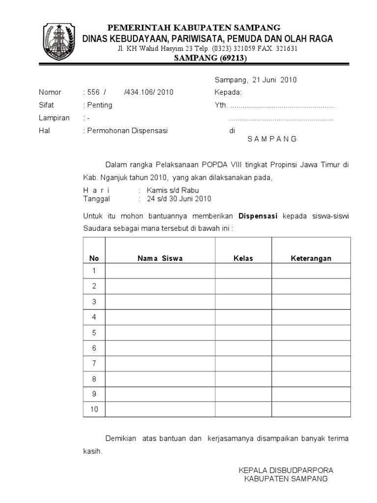 Terutama jika kantor tertentu sudah memiliki format surat dispensasi kerja misalnya maka tentu akan jauh lebih mudah dalam mengonsep surat saat dibutuhkan. Contoh surat dispensasi surat dispensasi adalah surat yang dibuat untuk diberikan kepada seseorang ataupun kelompok perusahaan instansi sekolah lembaga dll agar si pembuat surat diperkenankan meninggalkan tugas utamanya sementara karena ada tugas atau kegiatan yang lebih penting. 15 contoh surat dispensasi resmi untuk berbagai tujuan berbicara mengenai dispensasi tentu akan sangat erat kaitannya dengan tanggung jawab ataupun tugas utama kita. Kegiatan surat menyurat ini untuk pemberian tugas pelayanan masyarakat dan juga sebagai kegiatan pengarsipan berbagai macam kegiatan yang telah dilaksanan selama periode pemerintahan. Contoh surat dispensasi definisi format surat dispensasi kuliah dan organisasi surat dispensasi merupakan surat yang berisi alasan si pemohon atau pembuat surat karena tidak bisa melakukan kegiatan atau aktivitas tertentu dikarenakan ada hal lain yang harus diselesaikan. 15 contoh surat dinas pemerintah paling lengkap instansi pemerintahan tidak terlepas dari kegiatan surat menyurat.