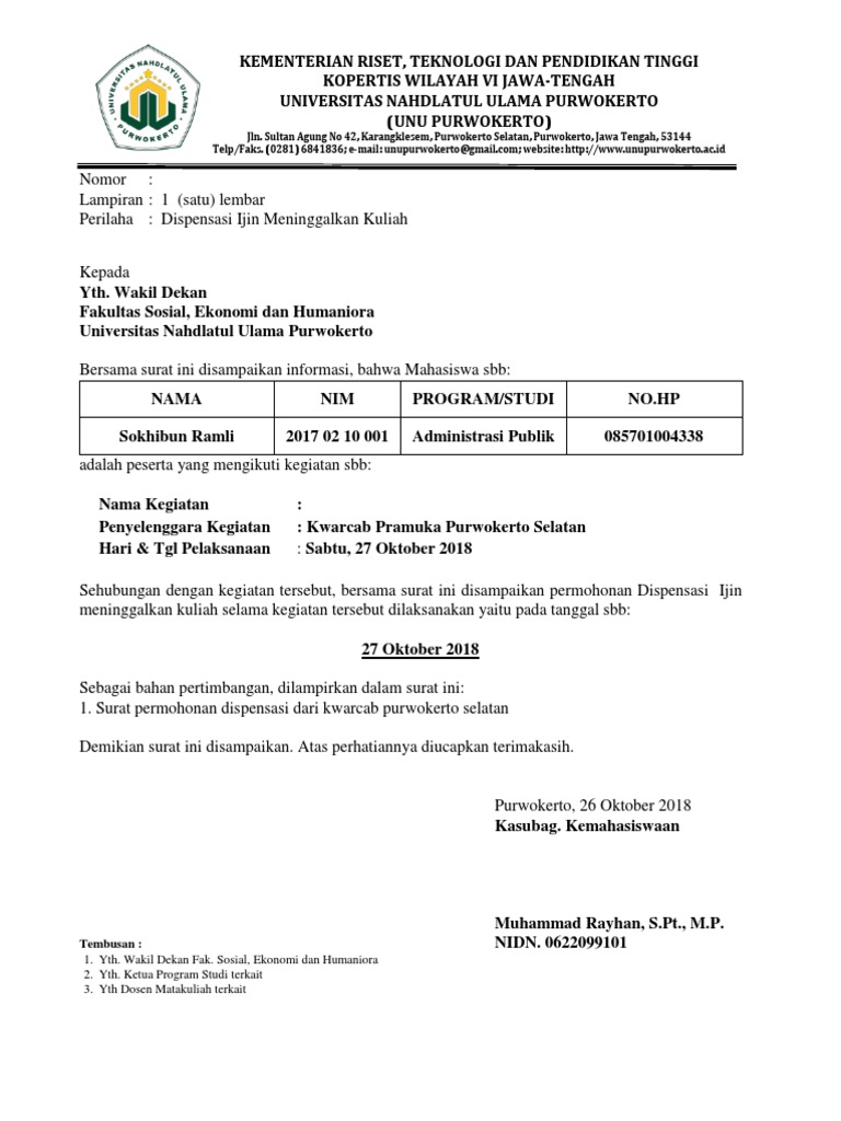 Terima kasih atas perhatiannya. Contoh surat dispensasi pramuka. Demikian surat permohonan dispensasi ini kami sampaikan untuk menjadi perhatian bapakibu guru agar menjadi maklum. Contoh surat ijin permohonan dispensasi by fendi kurniawan september 22 2019 0 comments. Fb twitter wa line pinterest g linkedin. Maka dari itulah surat dispensasi dipergunakan untuk menyatakan bebas dari kewajiban.