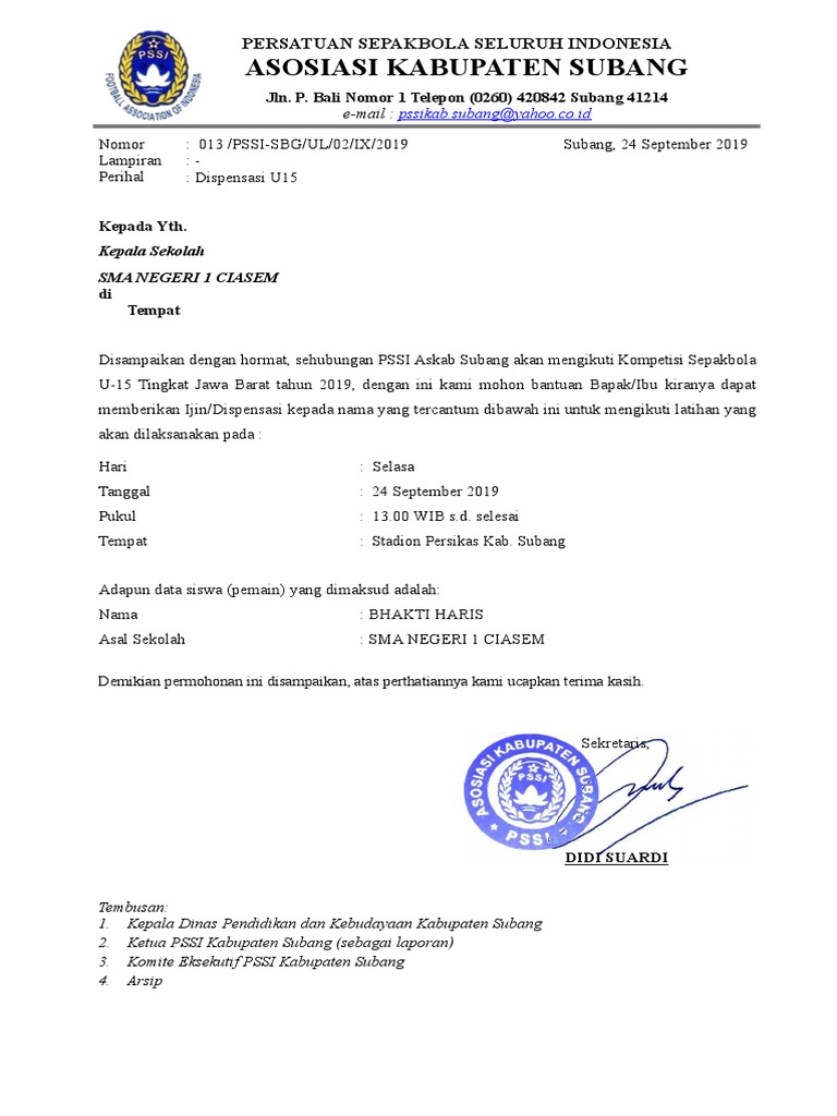 Contoh surat dispensasi sepak bola. Contoh surat dispensasi dari club persatuan sepak bola. 15 contoh surat dispensasi resmi untuk berbagai tujuan berbicara mengenai dispensasi tentu akan sangat erat kaitannya dengan tanggung jawab ataupun tugas utama kita. Memberikan surat dispensasi berarti memberikan persetujuan kepada yang bersangkutan. Berdasar dari hal tersebut maka kita bisa menyimpulkan tujuan dari surat dispensasi yakni untuk memberikan keringanan atas tanggung jawab yang seharunya kita kerjakan atau kita jalankan. 270 135 24510625 2008. 001 perssbduta i11 kepada sifat.