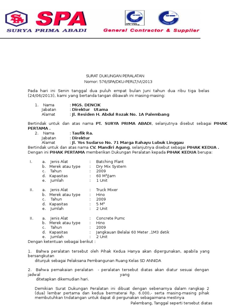 Rental alat berat selasa 05 mei 2015. Demikian surat dukungan peralatan ini dibuat dengan sebenarnya dalam rangkap 2dua lembar pertama dan kedua bermaterai rp. Contoh tugas makalah tata pemerintahan. Pt cv.