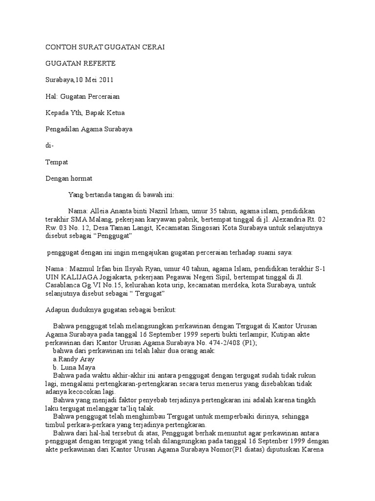 Contoh surat gugatan perdata wanprestasi. Contoh surat gugat cerai isteri kepada suami. 25 contoh surat pernyataan cerai paling lengkap yang baik dan benar contoh surat gugatan surat merupakan alat komunikasi antara seseorang dengan seseorang yang di kehendakinya yang berisi artikel pernyataan suatu info keinginan dan tanggapan yang sesuai dengan kemauan dari penulis surat hal yang demikian. Perceraian adalah sebuah cara yang tidak tepat dilakukan dalam berumah tangga. Identitas pihak pertama yang meminta cerai poin selanjutnya adalah menyebutkan identitas diri secara jelas pihak pertama atau pihak yang meminta perceraian. Tujuannya tentu saja untuk proses perceraian.