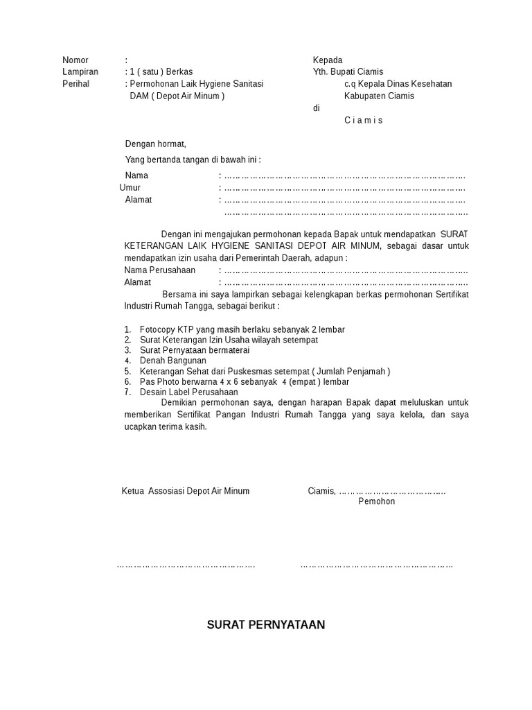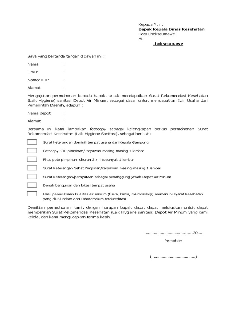 Contoh surat izin depot air minum. Contoh surat izin usaha bandar lampung 10 januari 2019. Klik banner dibawah untuk melaporkan masalah pelayanan publik rekomendasi surat izin depot air minum isi ulang 7942277. Format gambar contoh surat perizinan usaha yang benar 2019. Admin dari blog contoh seputar surat 2019 juga mengumpulkan gambar gambar lainnya terkait contoh surat penawaran air minum ke perusahaan dibawah ini. Berikut informasi sepenuhnya tentang contoh surat izin depot air minum. Contoh surat izin dari orang tua untuk mengikuti k.
