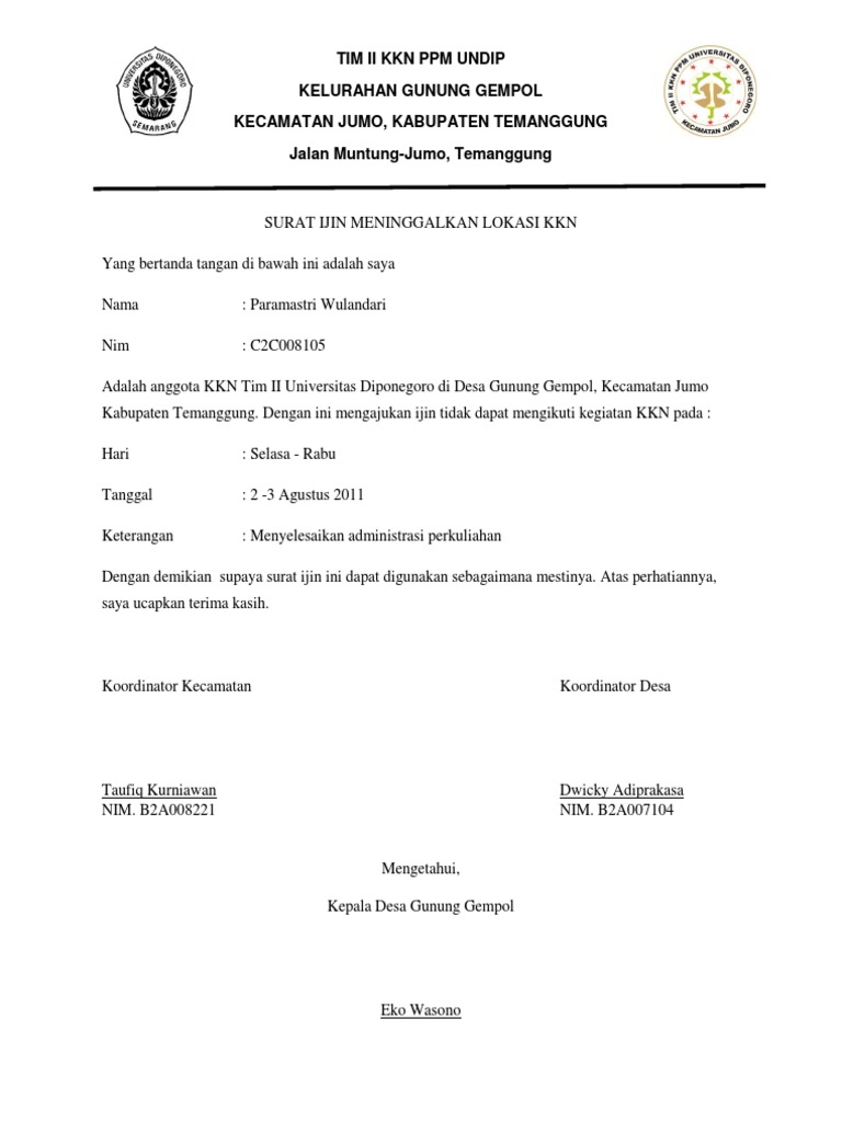 Kuliah kerja nyata angkatan xxxix tahun 2013. Sebelum membahas lebih lanjut mari simak uraian singkat dibawah ini sob. Surat permohonan izinlampiran. Pengalamannya biasanya surat izin dimulai dari jurusan minta tanda tangan kajur baru setelah itu dibawa ke dekanat untuk. Demikianlah contoh contoh surat izin yang bisa digunakan sebagai acuan dalam membuat surat izin tidak masuk kerja sekolah kuliah ataupun permintaan izin kegiatan. 15 contoh surat permohonan izin untuk berbagai kepentingan walaupun penggunaan surat belakagan ini sudah semakin menurun namun masih ada beberapa contoh surat yang tetap digunakan hingga sekarang.