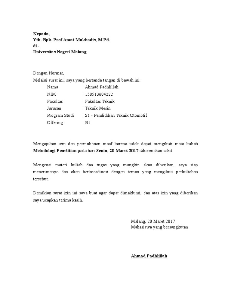 Contoh surat izin sakit. Asal tak bolos atau tidak masuk lebih dari empat kali di tiap mata kuliah maka mereka merasa aman. Karena pada artikel contoh surat izin tidak masuk kuliah ini akan kita bahas secara tuntas bagaimana menyusun suatu surat izin tidak masuk kuliah yang baik dan benar termasuk hal hal penting. Kalau alasannya karena sakit tinggal dirubah saja kata2 pada alasannya. 15 contoh surat izin kuliah terlengkap dengan berbagai alasan sebagai seorang mahasiswa yang menempuh pendidikan tinggi di salah satu universitas atau perguruan tinggi tentu memiliki tanggung jawab dan kewajiban terhadap kampus. Untuk mendownload contoh surat izin tidak masuk kuliah dalam format doc silahkan anda klik link berikut ini.