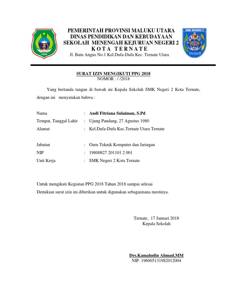 Contoh surat izin mengikuti ppg. Berikut ini contoh surat izin mengikuti ppg ppg. Contoh format surat keterangan izin belajar guru ppg salam hangat dan hormat. Dalam persyaratan untuk mengikuti ppg tahun 2019 selain harus menyertakan pakta integrias para peserta juga harus menyipakan surat izin mengikuti pembelajaran ppg dari kepala sekolah atau kepala yayasan tempat mengajar masing masing. Bagi anda yang belum memiliki surat izin dari kepala sekolah atau belum memiliki format surat izin tersebut maka anda dapat melihat contoh surat izin dari kepala sekolah untuk menjadi peserta ppg 20192020 pada artikel ini. Selain pakta integritas ada beberapa persyaratan yang harus dilengkapi oleh calon peserta ppgj 2019 dan salah satunya yakni surat izin belajar kepala sekolah ketua yayasan. Kegiatan pertama yang wajib diikuti peserta ppg adalah daring pembelajaran dalam jaringanonline lalu dilanjutkan pembelajaran tatap muka lokakarya di kampuslptk yang sudah ditunjuk.