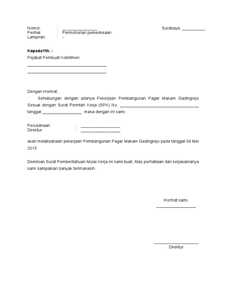 Contoh surat izin mulai kerja proyek. Surat pemberitahuan mulai kerja yaitu surat yang memberitahukan bahwa penyedia siap mengerjakan pekerjaan pengadaan dimulai sejak diterbitkannya spmk tersebut. 05spmkdesember2015 yang bertanda tangan di bawah ini selanjutnya di sebut. Jika ada sedang mencari contoh surat permohonan izin kerja proyek. Terima kasih telah berkunjung ke blog kumpulan contoh surat 2019. Berikut ini adalah bentuk penulisan atau contoh sebuah surat perintah kerja spk yang biasanya digunakan untuk memberikan wewenang kepada pihak yang di tunjuk agar segera memulai atau melaksanakan kegiatan proyek yang telah di rencanakan sesuai dengan kontraknya. Contoh surat izin mulai kerja proyek.