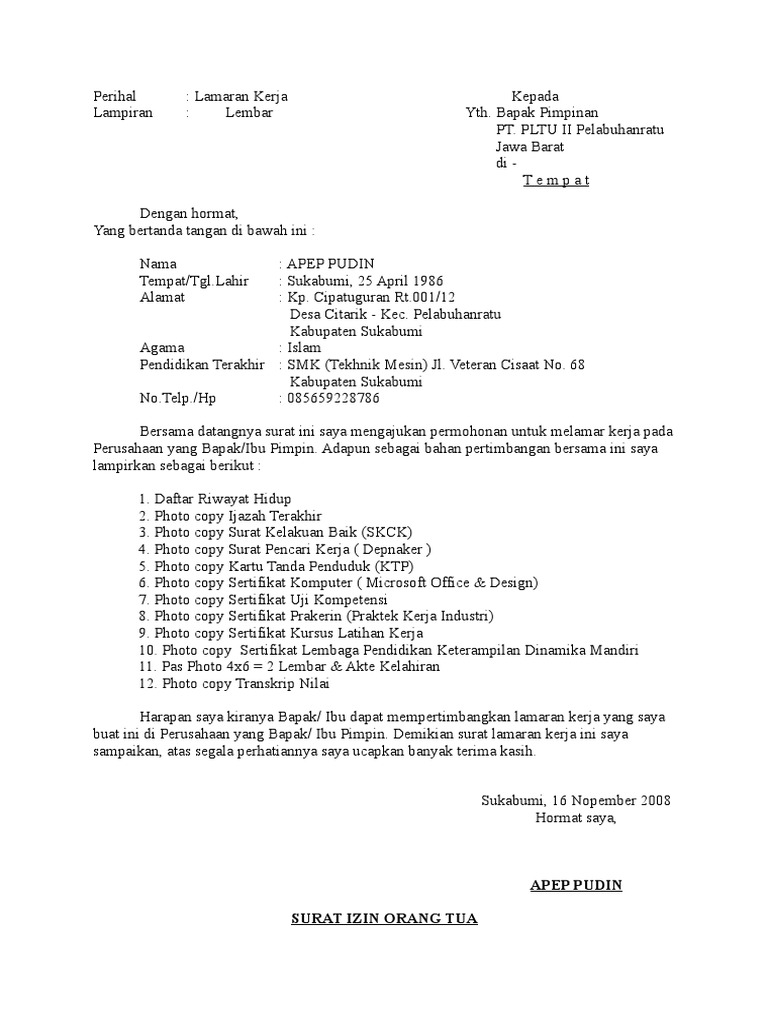 Surat Ijin Orang Tua Untuk Melamar Kerja Kumpulan Surat Penting