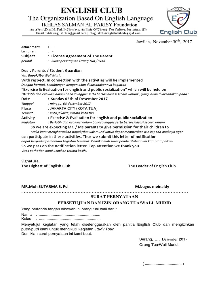 Sehubungan dengan akan dilaksanakannya kegiatan study tour mahasiswa jurusan bahasa inggris fakultas tabiyah iain sts jambi pada tanggal 12 21 mei 2014 selama 10 hari ke beberapa perguruan tinggi di indonesiamaka kami selaku panitia pelaksana scientific study tour for english department iain sts jambi memohon kepada bapakibu untuk memberikan izin kepada. Contoh surat izin orang tua untuk mengikuti kegiatan pramuka ada kalanya kita mengikuti sebuah kegiatan yang memerlukan izin dari orang tua.
