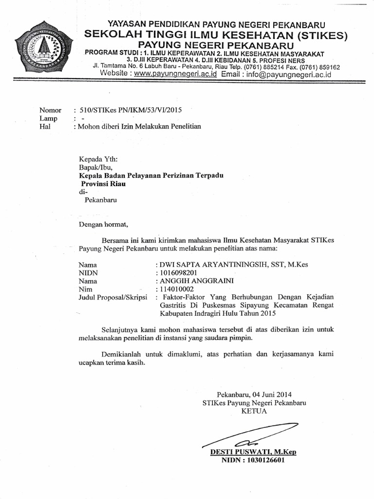 Surat izin kuliah secara umum secara umum surat izin kuliah ditulis layaknya surat surat lainnya yaitu dengan format dan bahasa yang tersusun rapi sehingga dosen pun tidak kesulitan membaca dan mencerna. Surat permohonan ini dibuat oleh pihak universitaskampus jika lingkup kampus yang luas surat ini akan dikeluarkan oleh bagian jurusanprogram studi namun pada kasus kasus tertentu surat ini sikeluarkan oleh bagian. Dikarenakan ada beberapa persyaratan administrasi mesti ia penuhi. Kegiatan penelitian dapat dilakukan di dalam kampus ataupun di luar kampus. Salah satunya adalah ia harus melampirkan foto copy surat permohonan izin penelitian skripsi dari univeristas.
