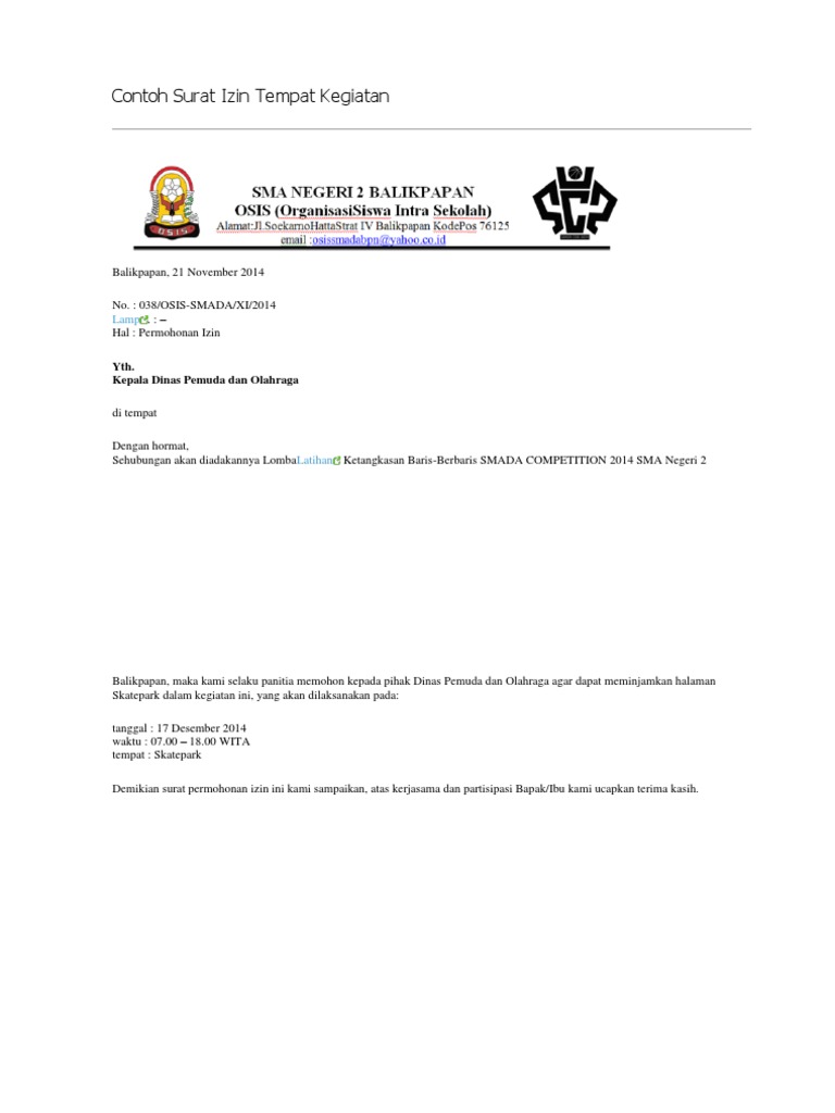 Ketika melaksanakan kegiatan bersama dengan para siswa maka sebaiknya pihak sekolah meminta izin terlebih dahulu kepada orang tua atau wali siswa. Contoh surat permohonan izin kegiatan. Contoh surat pemberitahuan setiap instansi sekolah pemerintah desa pemerintah daerah kabupaten pemerintah pusat organisasi komunitas perusahaan instansi pemerintah dan lembaga negara selalu melakukan kegiatan surat menyurat. Surat permohonan izin kegiatan bantuan dan sekolah format dan contoh surat surat permohonan izin merupakan sebuah surat yang dibuat dengan tujuan untuk meminta atau memohon izin kepada atasan atau kepada instansi terkait dimana orang tersebut bekerja. Contoh surat permohonan izin seperti surat surat lainnya yang memiliki beragam jenis di sebabkan oleh tujuan pembuatan dan fungsi surat yang berbeda yang sebelumnya sudah di bahas di blog ini seperti surat permohonan bantuanpada kesempatan kali ini kami akan mencoba menulis surat permohonan izin yang pada intinya tujuan yang di miliki adalah sama yaitu isinya tentang pengajuan permohonan. Contoh surat dinas sekolah surat masih menjadi sarana penting di institusi utamanya sekolah.