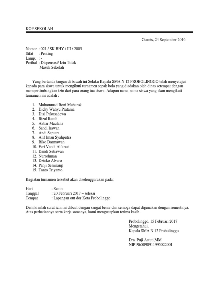 Surat izin tidak masuk sekolah mempunyai tujuan untuk memberitahukan kepada pihak sekolah bahwa siswa yang tercantum namanya di surat tersebut berhalangan hadir untuk belajar di sekolah. Oleh karena itu jika kalian sedang sakit dan tidak bisa mengikuti pelajaran yang ada di sekolah kalian dapat mengirimkan surat izin kepada pihak sekolah yang bersangkutan. Berdasar dari hal tersebut maka kita bisa menyimpulkan tujuan dari surat dispensasi yakni untuk memberikan keringanan atas tanggung jawab yang seharunya kita kerjakan atau kita jalankan. Surat izin ini dibuat untuk mendapatkan persetujuan dari pihak kepala sekolah atau madrasah bahwa tim yang akan dikirim atau siswa yang ikut lomba merupakan resmi dari sekolah dan atas. Beberapa contoh surat izin tidak masuk sekolah karena mengikuti lomba terbaik 2019. 15 contoh surat dispensasi resmi untuk berbagai tujuan berbicara mengenai dispensasi tentu akan sangat erat kaitannya dengan tanggung jawab ataupun tugas utama kita.
