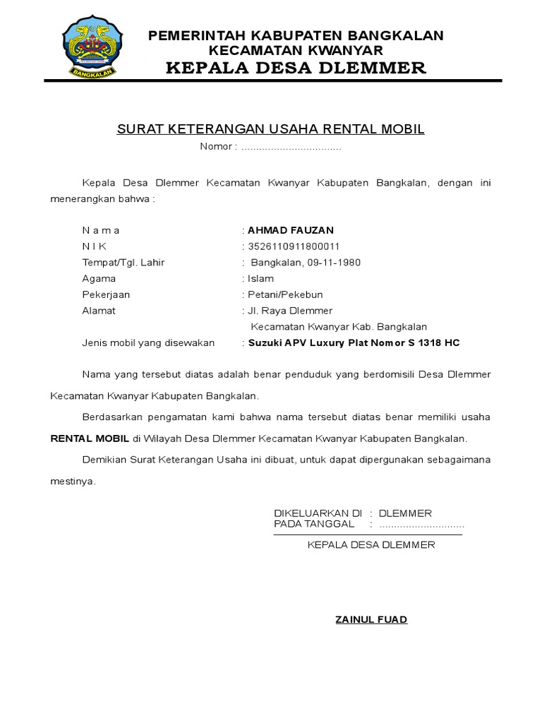 Usaha rental mobil ini berdiri pada tahun 2008 tepatnya pada tanggal 1 juni 2008. Jika diperlukan anda juga bisa mendownload surat perjanjian doc format word dalam ukuran a4 dan f4 atau folio. Surat surat izin dan referensi yang telah dimiliki dan photo copinya yang dilampirkan dalam proposal ini adalah. Seperti yang mungkin telah anda ketahui surat keterangan usaha sku adalah surat yang dibuat oleh aparat berwenang dalam hal ini kelurahan atau kepala desa untuk menerangkan bahwa orang yang namanya tertera dalam surat tersebut benar merupakan penduduk di rt dan rw yang berada di bawah kelurahan atau desa tersebut dan benar memiliki sebuah usaha yang disebutkan dalam surat tersebut. Anli rental ini dibuka dari jam 0900 pagi sd jam 2100 malam untuk hari senin sampai dengan jumat untuk hari sabtu dari jam 0900 pagi sd jam 1700 sore sedangkan untuk hari minggu tutup.