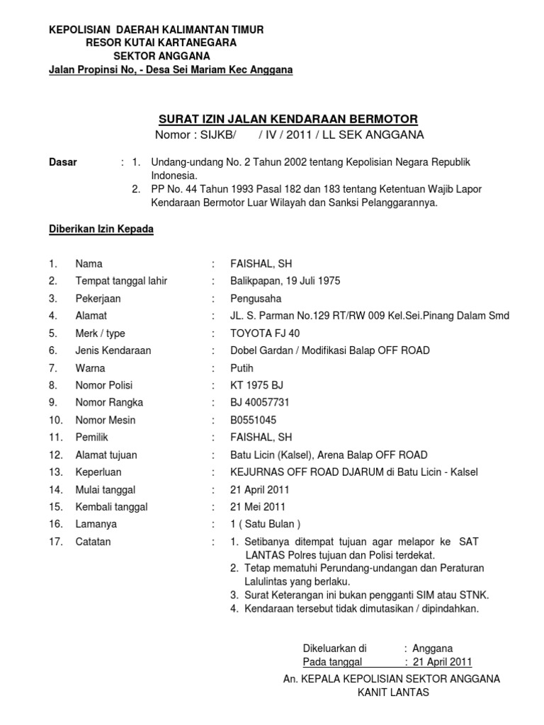 Contoh surat jalan kendaraan bermotor dari kepolisian. Download contoh surat jalan kendaraan doc. Contoh surat jalan selamat datang di portal hidupsimpel yak kali ini kita akan membahas tentang contoh surat jalan dari contoh surat jalan pengiriman barang kendaraan barang keluar tugas alat berat dinas desa perusahaan dan kendaraan kepolisian. Surat ini wajib diambil untuk dibawa saat diperiksa kepolisian maka dianggap kendaraan yang legal bukan curian karena sudah disertai surat jalan. Kepolisian sektor bulak sumur jl. Contoh surat pernyataan blokir stnk motor dan mobil saat anda akan melakukan blokir pajak motor atau mobil anda harus membuat surat pernyataan bahwa anda saat ini sudah bukan pemilik motormobil tersebut entah karena anda menjual kendaraan tersebut menghibahkanya atau karena kendaraan tersebut hilang. Sekian dulu pada kali ini dan terima kasih.