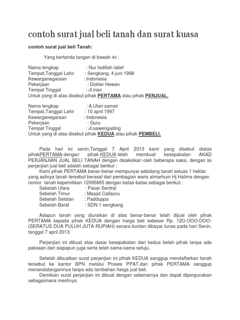 Contoh surat jual beli tanah warisan. Surat ini biasanya dibuat oleh seorang anak atau anggota keluarga yang berhak menerima warisan dari orang yang telah meninggal dunia. Download contoh surat kuasa ahli waris tanah yang baik dan benar disini. Isi surat keterangan jual beli tanah sebelum diaktakan selanjutnya yakni ijab kabul pembelian dilakukan secara sah dari pihak pertama kepihak kedua kemudian segala hal yang menyangkut dengan resiko yang menyangkut pajak atas tanah biaya pembuatan akta jual beli ke ppat menjadi tanggung jawab pihak kedua. Contoh surat contoh surat lamaran kerja bahasa inggris yang sederhana. Demikian penjelasan mengenai surat kuasa ahli waris untuk menjual tanah atau rumah dan sekilas mengenai jual beli tanah atau rumah warisan. Semoga artikel ini membantu anda dan proses penjualan tanah atau rumah warisan yang hendak anda lakukan berjalan dengan lancar karena anda telah memenuhi persyaratan dan juga hukum yang berlaku mengenai penjualan atas tanah atau rumah warisan.
