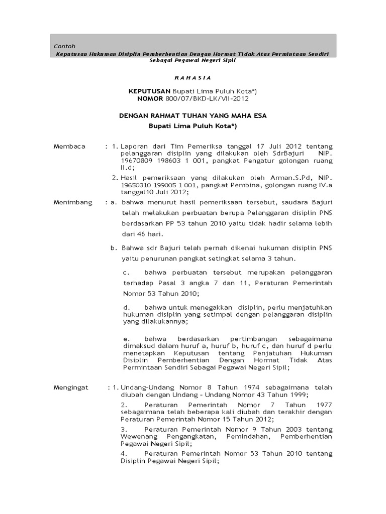 Atau surat berharga milik negara secara tidak sah. Dan jika anda melanggar peraturan kerja seperti sering terlambat masuk kantor ataupun sering absen tanpa pemberitahuan maka anda akan diberikan surat teguran oleh atasan anda. Selain menetapkan penjatuhan hukuman disiplin sebagaimana dimaksud pada ayat 3 juga berwenang menetapkan penjatuhan hukuman disiplin bagi pns yang menduduki jabatan struktural eselon iv ke bawah jabatan fungsional tertentu jenjang pertama dan pelaksana lanjutan dan jabatan fungsional umum golongan ruang iiid ke bawah di lingkungannya untuk jenis hukuman disiplin sebagaimana dimaksud. Dalam peraturan tersebut juga secara tegas disebutkan jenis. Sebenarnya contoh format surat pernyataan tidak pernah dijatuhi hukumun disiplin pns itu tersedia dalam lampiran keputusan kepala badan kepegawaian nomor 12 tahun 2002 pada tanggal 17 juni 2002. Surat keberatan merupakan salah satu jenis surat yang bersifat formal.