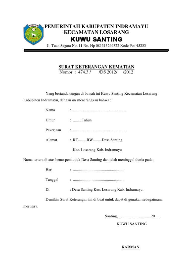 Contoh surat kematian dari desa. Contoh surat keterangan kematian 2 adalah surat keterangan kematian yang diterbitkan oleh dinas kependudukan dan catatas sipil disdukcapil yang biasa digunakan untuk mengajukan pencairan dana asuransi jiwa pembagian hak waris dl. Surat kematian dibuat untuk berbagai keperluan terkait misalnya untuk membuat pengalihan harta warisan asuransi menghapus keluarga yang meninggal dari kartu keluarga dan kepentingan lainnya. Surat keterangan kematian adalah sebuah surat yang dikeluarkan oleh kelurahan atau desa untuk menerangkan bahwa seseorang telah meninggal dunia. Jika benar anda datang di situs yang tepat. Surat kematian surat keterangan kematian apakah anda sedang mencari contoh surat keterangan kematian terbaru. Surat keterangan kematian dari kelurahan desa surat kematian merupakan jenis surat yang dibuat oleh pihak yang berwenang yang menerangkan bahwa seseorang telah meninggal dunia.