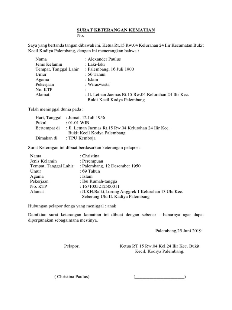 Contoh surat kematian download contoh surat kematian doc. Surat keterangan kematian juga dapat diterbitkan oleh pihak kepolisian jika ada alasan khusus seperti karena telah melewati otopsi jenazah atau yang lainnya.