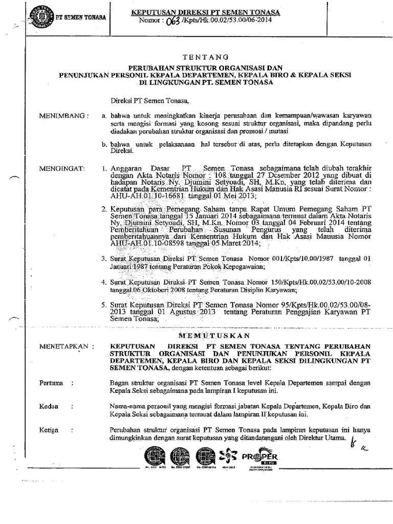 Bahwa dalam rangka pelaksanaan kegiatan usaha pt. Seperti halnya surat resmi yang lain maka surat keputusan juga memiliki atribut atribut pokok seperti kop instansiorganisasi pokok surat nomor dan tanggal surat serta tanda tangan pejabat yang mengeluarkan surat tersebut.