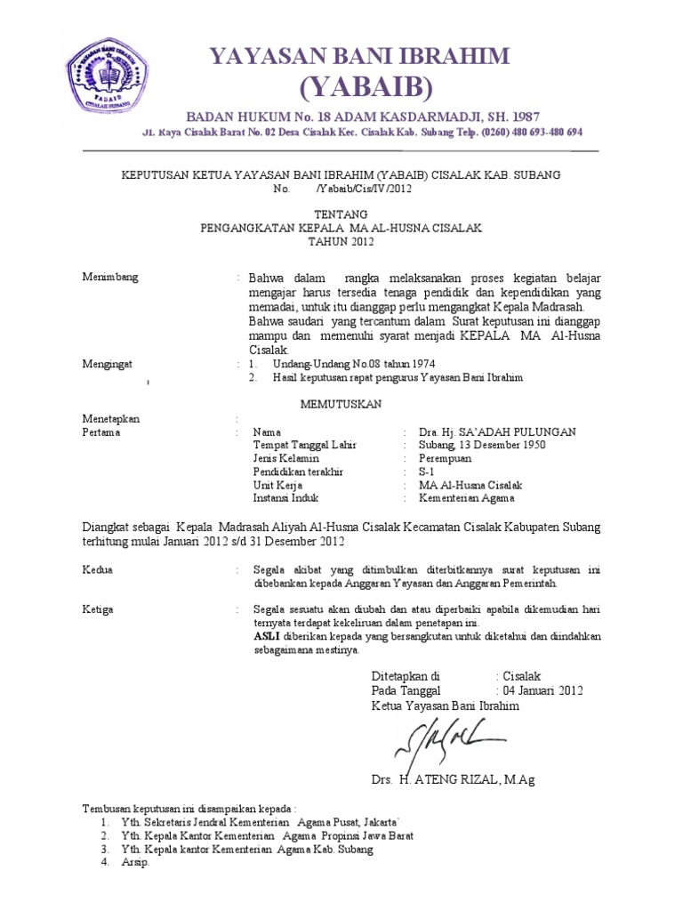 Contoh surat keputusan yayasan. 345skyp09 tentang pengangkatan ketua universitas teologi indonesia. Contoh surat keputusan pengangkatan kepala sekolah merupakan surat keputusan yang dikeluarkan oleh ketua yayasan tentang pengangkatan kepala sekolah yang barujika anda ingin melihat bagaimana contohnya berikut ini kami sertakan di bawah ini. Semua dosen yang namanya tercantum pada lampiran surat keputusan ini merupakan yang terpilih untuk menjadi penasehat akademik. 659 pm posted by indana labels. Surat keputusan pengurus yayasan pesantren islam ypi tanjung anom nomor. 11ypiskvii2009 tentang pengangkatan tenaga kerja gurusebagai guru tetap yayasa di mts yayasan pesantren islam ypi tanjung anom kecpancur batu kabupaten deli serdang memperhatikan.