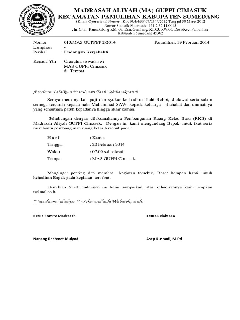 Contoh surat undangan kerja bakti rt. Surat undangan kerja bakti rt kali ini saya tidak akan membahas lebih lanjut tentang kerja bakti. Medan 13 februari 2018. Berikut adalah sebuah contoh surat yang bisa anda jadikan bahan referensi untuk membuat surat undangan kerja bakti yang baik dan benar. Download 1250 kb surat edaran warga untuk kerja bakti download. Surat ini cukup simpel namun tetap harus memperhatikan format penulisan maupun kalimat yang tersusun.