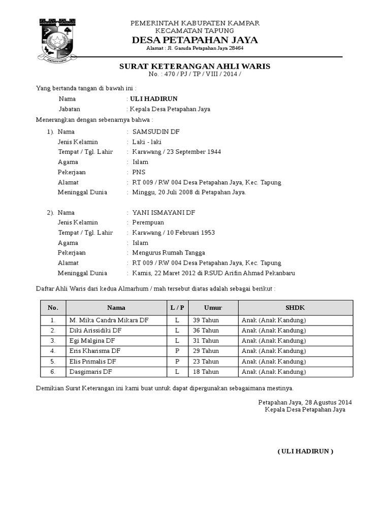 Contoh surat keterangan kerja dari lurah contoh surat keterangan ahli waris dari lurah kepala desa contoh surat keterangan ahli waris yang benar sertifikat warisan yang akan menjelaskan masalah yang diwarisi oleh orang tua biasanya kepada anaknya sebagai ahli waris harta masa depan. Surat ini biasanya dibuat oleh seorang anak atau anggota keluarga yang berhak menerima warisan dari orang yang telah meninggal dunia. Dalam ulasan ini anda akan menemukan contoh surat pernyataan ahli waris 2019 terbaru dalam bentuk format doc word maupun pdf yang dapat anda download unduh filenya secara gratis dan mudah. Untuk lebih jelasnya anda bisa melihat contoh surat keterangan domisili tempat tinggal dari rt di bawah ini. Demikian surat keterangan dan pernyataan ahli waris ini kami buat dengan sebenarnya diatas kertas bermaterai cukup dalam keadaan sehat jasmani dan rohani tanpa ada tekanan maupun paksaan dari siapapun dan apabila dikemudian hari keterangan dan pernyataan kami tidak benar maka kami bersedia dituntut sesuai. Para ahli waris dari almarhum zulkifli menerangkan menyatakan dengan sesungguhnya dengan sanggup diangkat sumpah bahwa zulkifli tempat tinggal terakhir di desa kecamatan.