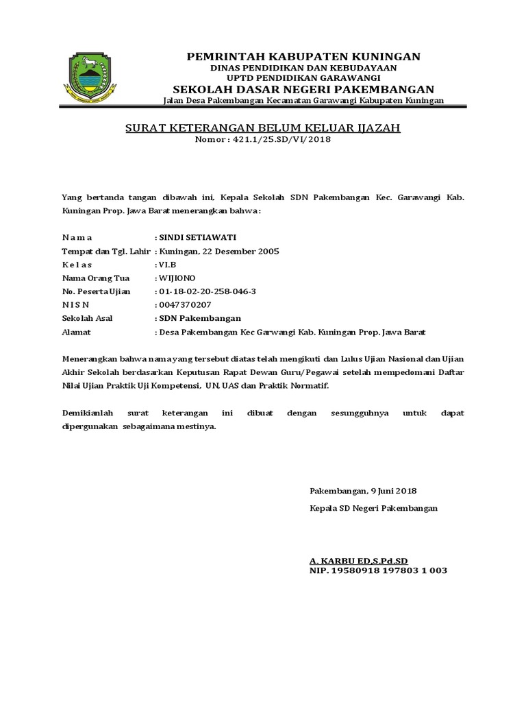 Contoh surat keterangan ijazah belum keluar. Contoh tulisan karya innovatif. Contoh surat keterangan belum keluar ijazah. Oleh karena itu untuk menyikapi hal tersebut kami memandang perlu untuk memberikan format surat keterangan ijazah belum keluar yang terbaru yang dipergunakan untuk mendaftar ke sekolah tersebut. Surat keterangan lulus skl merupakan sebuah surat yang diterbitkan oleh pihak sekolahmadrasah sebagai solusi dan pengganti dari ijazah yang belum keluar. Contoh surat keterangan lulus sementara sd smp sma doc surat keterangan lulus sekolah adalah surat yang diterbitkan oleh pihak sekolah sebagai solusi dan pengganti dari ijazah yang belum keluar. Contoh surat keterangan lulus sekolah dasar.