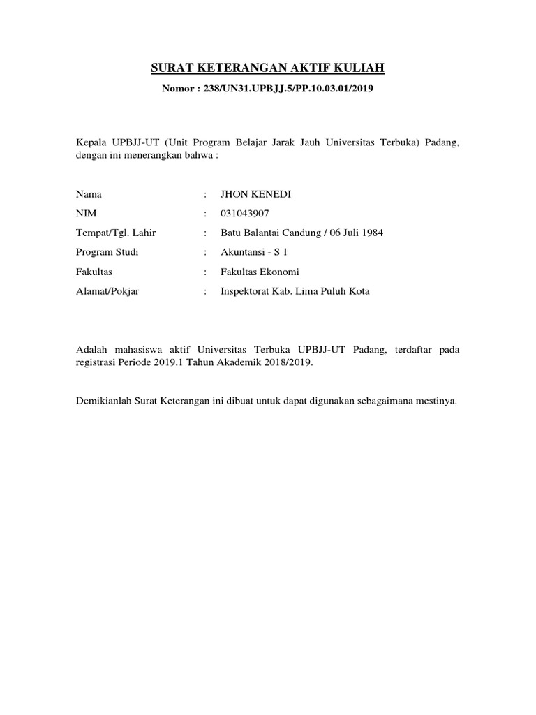 Sementara ijazah belum terbit bolehkah saya menggunakan dulu surat keterangan lulus ketika daftar. Kami mengulas tentang contoh surat keterangan kuliah di universitas terbuka. Itulah contoh surat keterangan kuliah di universitas terbuka yang dapat admin kumpulkan. Berikut ini contohnya silakan dilihat dicermati didownload dan dirubah sesuai kebutuhan anda. Adalah mahasiswa universitas terbuka yang teregistrasi pada masa registrasi 20081 sampai dengan masa ujian 20151 di upbjj ut pekanbaru. Demikian surat pernyataan ini dibuat dengan sebenar benarnya untuk dapat dipergunakan sebagaimana mestinyadan apabila keterangan tersebut tidak benar maka saya bersedia dikenakan sanksi sesusai dengan peraturan yang berlaku.