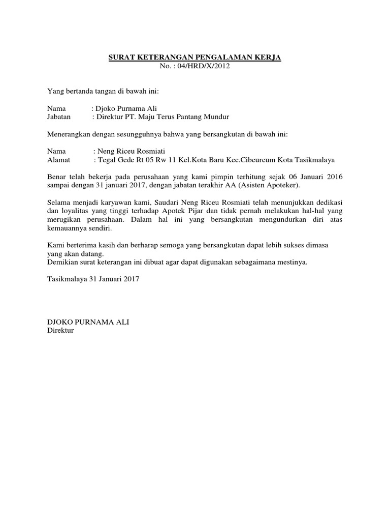 Surat keterangan pengalaman kerja adalah surat pernyataan dari pemimpin suatu perusahaan yang isinya menyatakan bahwa seseorang atau anda pernah bekerja dengan jabatan tertentu dengan maksud untuk dapat dijadikan bahan pertimbangan untuk diterimanya anda bekerja di perusahaan baru yang anda lamarsurat pengalaman kerja ini biasanya dilampirkan pada surat lamaran kerja yang anda kirimkan dan. Contoh surat pengalaman kerja bagi seseorang yang sudah pernah bekerja di suatu perusahaan dalam waktu tertentu kemudian berhenti mengundurkan diri sudah bisa mendapatkan surat pengalaman kerja.