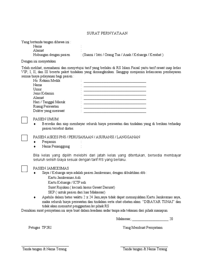 Dengan menunjukkan surat pernyataan ini secara resmi perusahaan akan menanggung biaya rumah sakitnya sesuai aturan yang berlaku di perusahaan tersebut. The most secure digital platform to get legally binding electronically signed documents in just a few seconds. Ca buta tuli retinopaty. Surat keterangan dokter untuk rawat inap. Contoh surat keterangan sakit dan rawat inap. Jenis layanan rawat inap rawat jalan type of service hospitalization out patient.