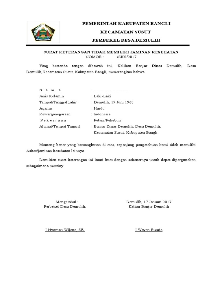 Contoh surat keterangan tidak mempunyai jaminan kesehatan. Surat ini menjadi salah satu dokumen pelengkap yang harus dimiliki jika mendaftar pada instansi atau perusahaan tertentu. Sedangkan keterangan mengenai kesehatan yang detail keterangan tidak pernah terlibat organisasi terlarang. Dan jika tidak memenuhi kewajiban maka pihak penerima jaminan akan mengawasi kita sebagai pemberi jaminan dan harus memenuhi tanggung jawab yang tertera di surat jaminan yang telah disepakati. 15 contoh surat pernyataan paling lengkap untuk berbagai kebutuhan belakangan ini penggunaan surat memang bisa dibilang sudah semakin minim terlebih untuk urusan pribadi. Contoh surat pengantar dari perusahaan ke bpjs kesehatan setiap perusahaan yang memiliki karyawan wajib mendaftarkan karyawan karyawannya ke bpjs ketenagakerjaan dan kesehatan. Surat keterangan sudah menikah ini merupakan salah satu dokumen yang wajib untuk anda miliki sebagai bukti tambahan bahwa anda telah menikah selain adanya buku.