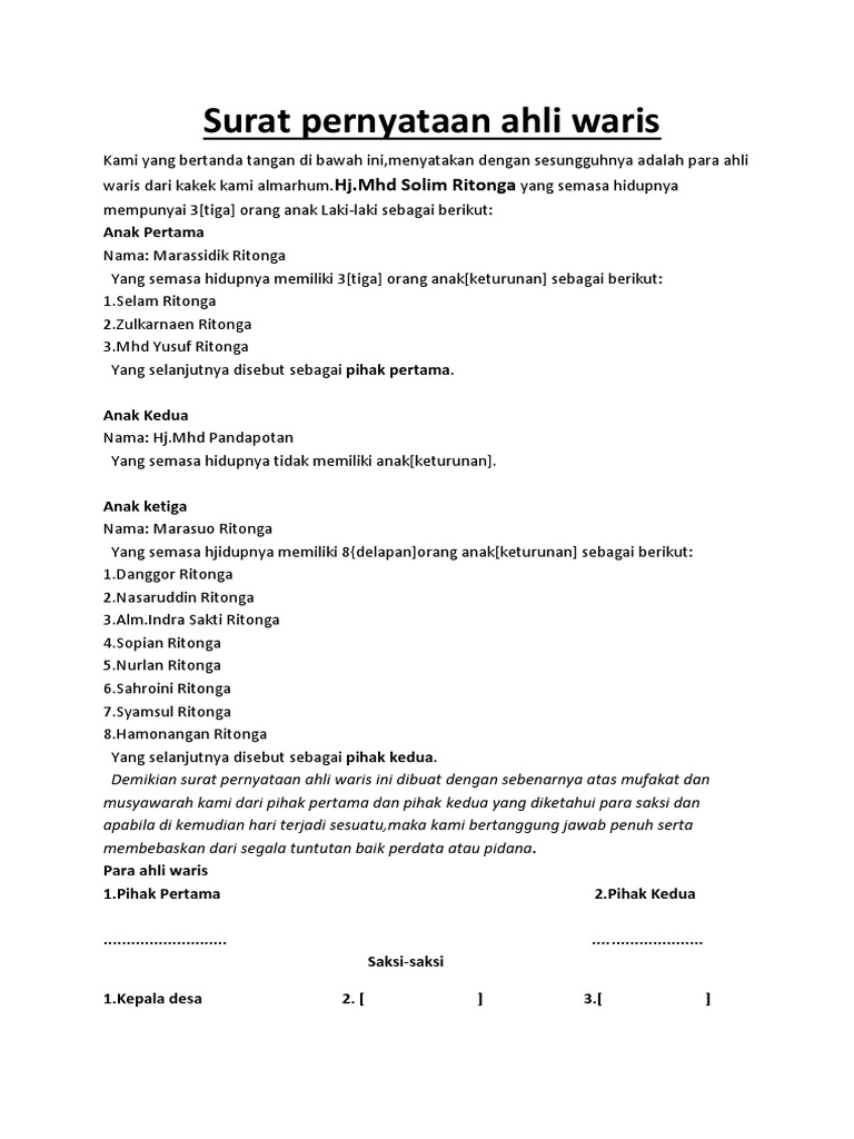 Contoh surat keterangan waris. Urusan urusan tersebut meliputi pengajuan pinjaman ke bank pengambilan barang atau uang yang masih atas nama orang yang sudah meninggal. Contoh surat keterangan kesepakatan pembagian harta waris. Mengenai cara mengurus surat hak waris ke kepala desa lurah atau camat anda bisa membacanya di. Contoh surat keterangan bagi waris contoh surat keterangan ahli waris ini tentunya akan menjelaskan tentang siapa saja ahli waris dari seseorang pewaris sehingga harta peninggalan dari pewaris menjadi jelas akan jatuh ke tangan siapa. Surat ini biasanya dibuat oleh seorang anak atau anggota keluarga yang berhak menerima warisan dari orang yang telah meninggal dunia. Nah jika anda saat ini sedang mencari referensi untuk membuat surat keterangan ahli waris ini silahkan simak terus halaman ini sampai selesai.