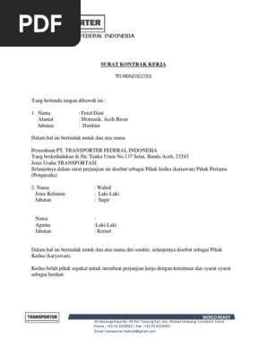 Berikut beberapa contoh format surat perjanjian kontrak kerja yang umumnya dipakai oleh perusahaan perusahaan. Contoh surat perjanjian kerja karyawan. Ada banyak lowongan pekerjaan yang disediakan oleh berbagai macam instansi ataupun perusahaan baik negeri atau swasta. Halo rekan dunia hukum surat perjanjian melalui blog ini akan dibagikan contoh surat perjanjian kemitraan antara supir dengan perusahaan jasa pengangkutan yang dibuat dengan bahasa yang sangat sederhana untuk memudahkan memahami maksud dan tujuannya. Contoh surat lamaran kerja driver pada saat akan melamar pekerjaan satu hal yang harus anda perhatikan adalah saat akan membuat surat lamaran kerja.