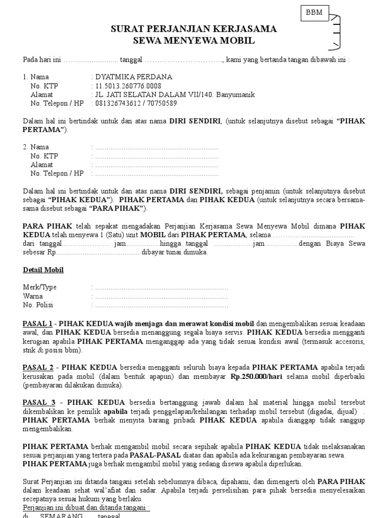 Ditambah lagi pada saat ini juga sudah ada banyak sekali informasi mengenai lowongan kerja dengan. Di akhir artikel ini juga anda dapat lihat contoh surat perjanjian over kontrak untuk berbagai keperluan terbaru tahun 2019. Mohon maaf apabila terdapat kesamaan namatempatinformasi lain karena surat yang dibuat hanya bertujuan sebagai percontohan tanpa ada maksud apapun. Namun apapun bentuknya mau pribadi atau usaha tentunya membutuhkan perjanjian yang mengikat kedua belah pihak penyewa dengan yang menyewakan. 15 contoh surat perjanjian sewa mobil paling lengkap pada dasarnya sewa menyewa mobil bisa dilakukan secara pribadi atau melalui jasa atau usaha rental mobil. Surat perjanjian kerja karyawan ini bisa dimodifikasi sesuai situasi kondisi dan kesepakatan.