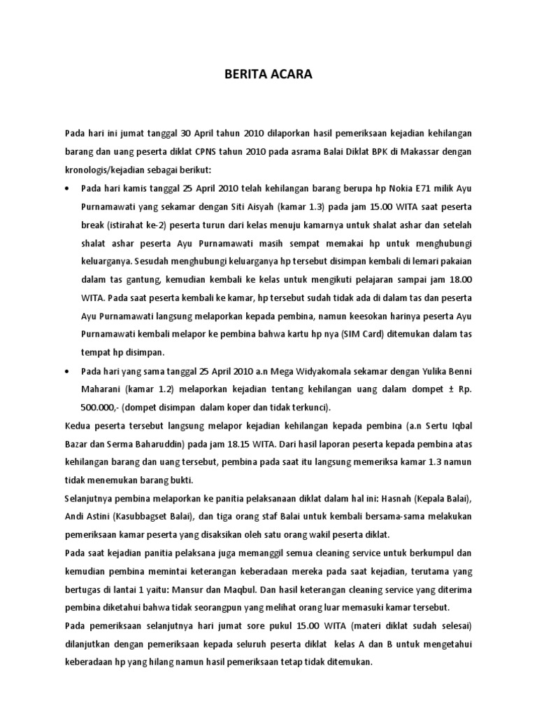 Apa yang harus dilakukan oleh perusahaan ketika kehilangan barang. Mungkin sangat jarang dan bahkan tidak pernah membuatnya. Tidak semua orang memahami apa itu berita acara dan tahu bagaimana cara membuatnya. Download draf berita acara lainnya. Misalnya saja disaat kita kehilangan beberapa dokumen dan barang berharga seperti stnk sim bpkb ktp kartu tanda mahasiswa ktm ijazah faktur kwitansi kartu bpjs sertifikat surat kepemilikan tanah dan lainnya atau kehilangan sesuatu berbentuk barang yang dapat dikatakan sangat penting bagi kita. Adapun kronologi kehilangan barang tersebut adalah sebagai berikut.