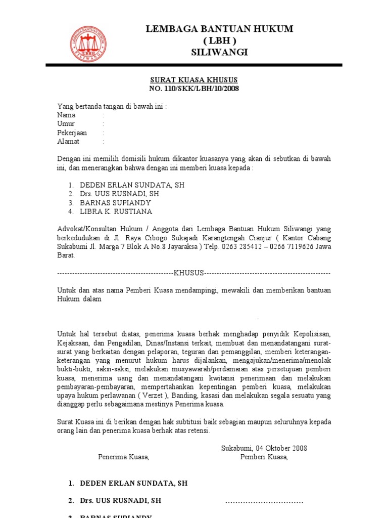 Smpn 1 simpang empat 2002 2005 3. Demikianlah surat kuasa ini diperbuat dengan sebenarnya oleh kami para advokatpengacara dan penasehat hukum pada kantor pengacaralaw office di jl. Contoh surat kuasa khusus jika diartikan secara sederhana maka surat kuasa khusus merupakan surat yang berisi pemberian kuasa atau wewenang kepada seseorang yang dapat dipercaya agar orang tersebut bertindak mewakili pemberi kuasa. Pemberian surat kuasa dalam urusan hukum itu terutama berkaitan dengan suatu perkara biasanya diberikan kepada seorang pengacaralawyer atau advokat. Misalnya surat kuasa untuk perwakilan pengambilan ijazah pengambilan uang gaji pengambilan paspor pengambilan dokumen dokumen penting dan lain lain. Jika dilihat dari sifatnya surat kuasa bukan surat yang berbadan hukum permanen melainkan bisa menjadi surat biasa asalkan si pemberi kuasa mencabut kuasa yang telah diberikan.