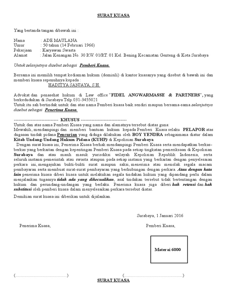 Contoh surat kuasa pendampingan hukum. Sebagai pengacara muda yang memiliki integritas dan selalu menjunjung tinggi profesionalitas serta berpengalaman dalam menangani. 5 contoh surat kuasa advokat atau pengacara advokat pengacara adalah orang yang mewakili kliennya untuk melakukan tindakan hukum berdasarkan surat kuasa yang diberikan untuk pembelaan atau penuntutan pada acara persidangan di pengadilan atau beracara di pengadilan seperti proses litigasi. Baik anda selaku terdakwa ataupun selaku pendakwa anda tetap memiliki hal untuk meminta pendampingan hukum dari advokat. Khoirul amin associates law firm adalah merupakan kantor hukum tempat bernaung para advokat pengacara muda yang memiliki semangat kerja tinggi untuk melakukan pembelaan dan pendampingan serta mempertahankan hak hak dan kepentingan klien selaku pemberi kuasa. Contoh surat kuasa pendampingan hukum khoirul amin associates law firm adalah merupakan kantor hukum tempat bernaung para advokat pengacara muda yang memiliki semangat kerja tinggi untuk melakukan pembelaan dan pendampingan serta mempertahankan hak hak dan kepentingan klien selaku pemberi kuasa. Demikianlah surat kuasa ini diperbuat dengan sebenarnya oleh kami para advokatpengacara dan penasehat hukum pada kantor pengacaralaw office di jl.