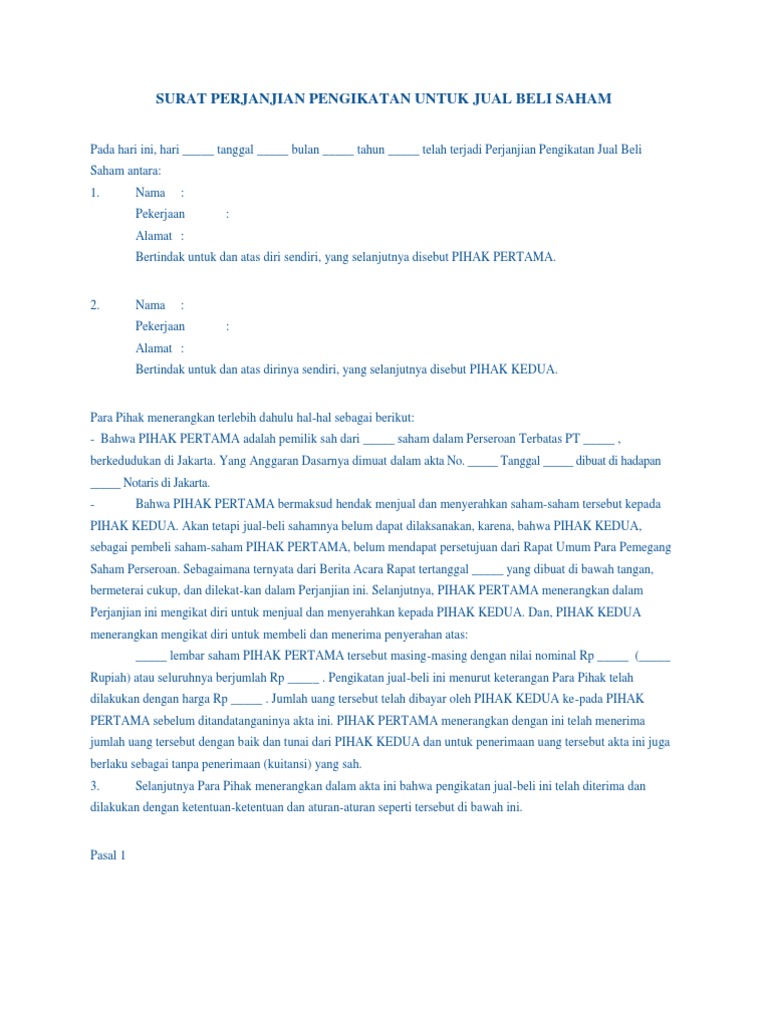 Pengalihan ganti rugi untuk pengalihan segala hak dan kepentingan atas sebidang tanah beserta benda benda yang berada diatasnya sebagaimana tersebut pada butir a telah disepakati dan ditetapkan oleh kedua belah pihak baik pihak pertama maupun pihak kedua sebesar rp dengan jumlah uang tersebut telah diterima oleh pihak pertama dan surat pernyataan ini berlaku pula sebagai tanda bukti. Contoh draft ke 1 surat perjanjian jual beli saham 17. Contoh surat kuasa dalam mewakili di rapat umum pemegang saham rups.