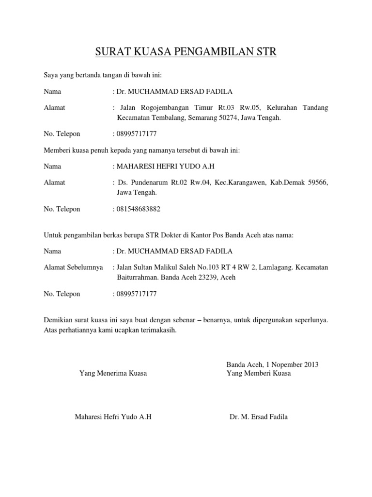 Direktur utama nama perusahaan. Artinya bahwa str ini sangat penting bagi tenaga kesehatan untuk keperluan karirnya. Yah str adalah surat tanda registrasi yang diberikan oleh pemerintah kepada tenaga kesehatan yang sudah memiliki kompetensi. Pemberian kuasa ini bisa bermacam macam misalnya kuasa untuk urusan yang berhubungan dengan kasus hukum kuasa pengurusan dokumen kuasa pengambilan barang uang kuasa pengambilan barang misalnya bpkb sertifikat tanah ijazah dll. Contoh surat kuasa pengambilan pengambilan dokumen import 3. Berikut contoh surat permohonan utusan peserta suatu kegiatan di kegiatan kemahasiswaan semoga surat ini bisa bermanfaat.