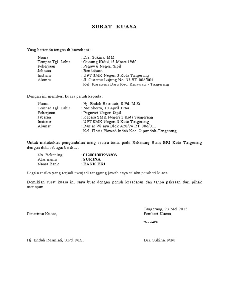Contoh surat kuasa pengambilan uang pinjaman di bank bri. Materai inilah sebagai penguat hukum dan harus disertakan. Mohon maaf apabila terdapat kesamaan namatempatinformasi lain karena surat yang dibuat hanya bertujuan sebagai percontohan tanpa ada maksud apapun. Semoga bermanfaat untuk anda yang sedang menulis format surat kuasa bank. Preview contoh surat kuasa pengambilan uang di bank mandiri versi ms. Contoh surat kuasa pengambilan uang pinjaman di bank bri seperti yang sudah anda ketahui meminjam uang di bank pasti membutuhkan syarat khusus tertentu sesuai dengan ketentuan yang diberlakukan di bank tersebuttak terkecuali saat anda mengajukan pinjaman ke bank bri. Menulis surat kuasa bank seperti surat kuasa pengambilan uang di bank bukanlah hal yang susah.