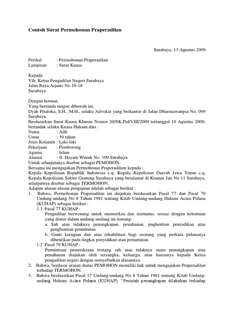 Contoh surat kuasa surat kuasa khusus. Sah atau tidaknya suatu penangkapan dan atau penahanan atas permintaan tersangka atau keluarganya atau pihak lain atas kuasa tersangka. Contoh surat permohonan praperadilan tindak pidana perihal. Wiraswasta beralamat di jl. Kepada yth ketua pengadilan negeri palembang. Yang bertanda tangan dibawah ini kami.